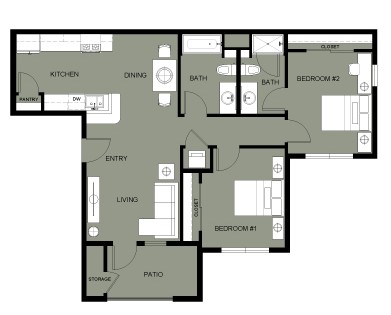 The apartment is a 983 sq ft 2 bedroom, 2 bath on the second floor of Skyline Luxury Apartments, building 4. The floor plan looks like this: